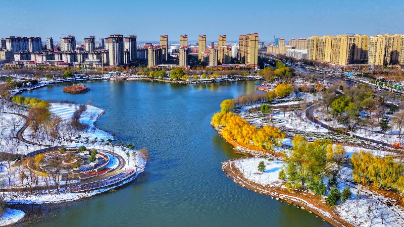 12月13日,扶沟县人民公园白雪皑皑、天蓝水清、柳树正黄,与远处耸立的高楼,共同构成一幅绝美画卷,成为市民休闲散步的好去处。 黄金峰 摄