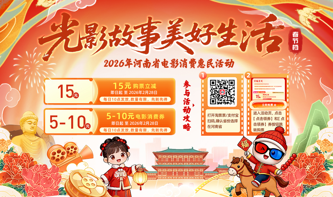 2026年马年春节临近,为丰富节日期间群众文化生活,促进电影市场消费,河南省委宣传部(省电影局)联合淘票票平台推出“光影故事 美好生活”观影消费补贴惠民活动,覆盖河南省内所有正常营业影院及春节档全部影片。具体领券规则及操作步骤如下:打开淘票票APP或支付宝,扫码后选择河南省,即可参与领券;15元购票立减券、5-10元电影消费券,均自即日起至2026年2月28日,每日10点发放,数量有限、先到先得。